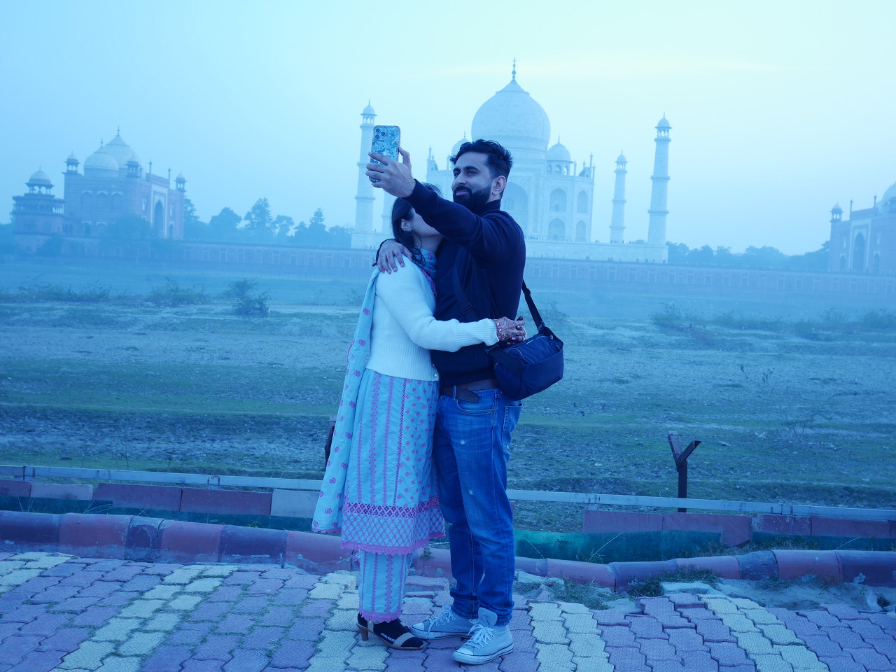 타지마할을 배경으로 기념사진을 찍는 현지인.