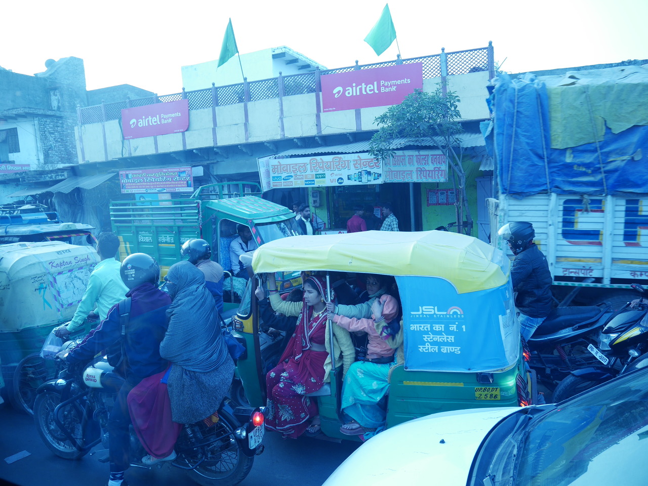 파고 드는 오토바이와 릭샤, 좁은 차내로 들어가지 못하고