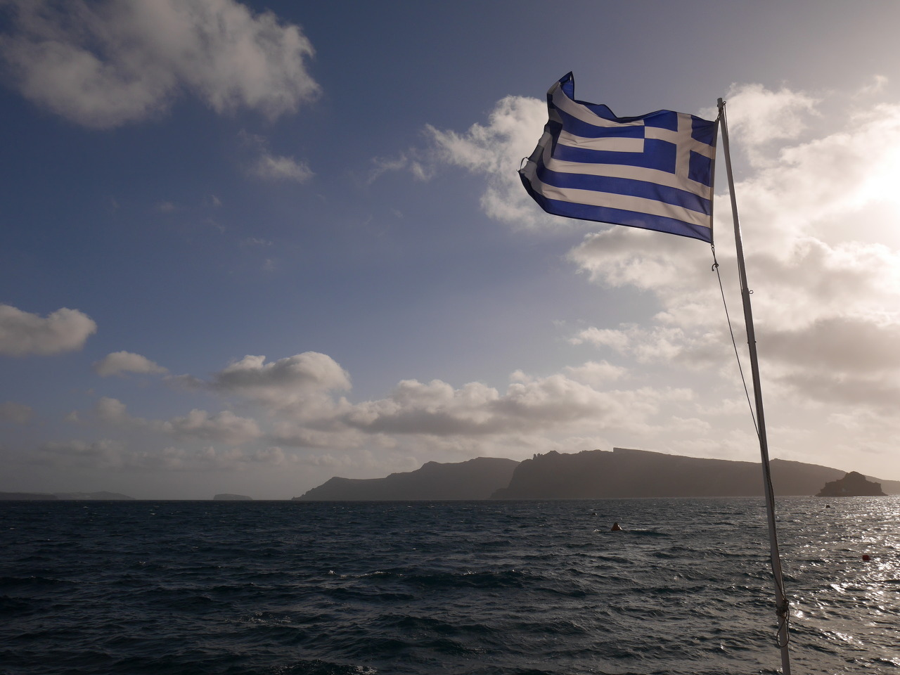 드디어 도착한 선착장에 나부끼는 그리스 국기.