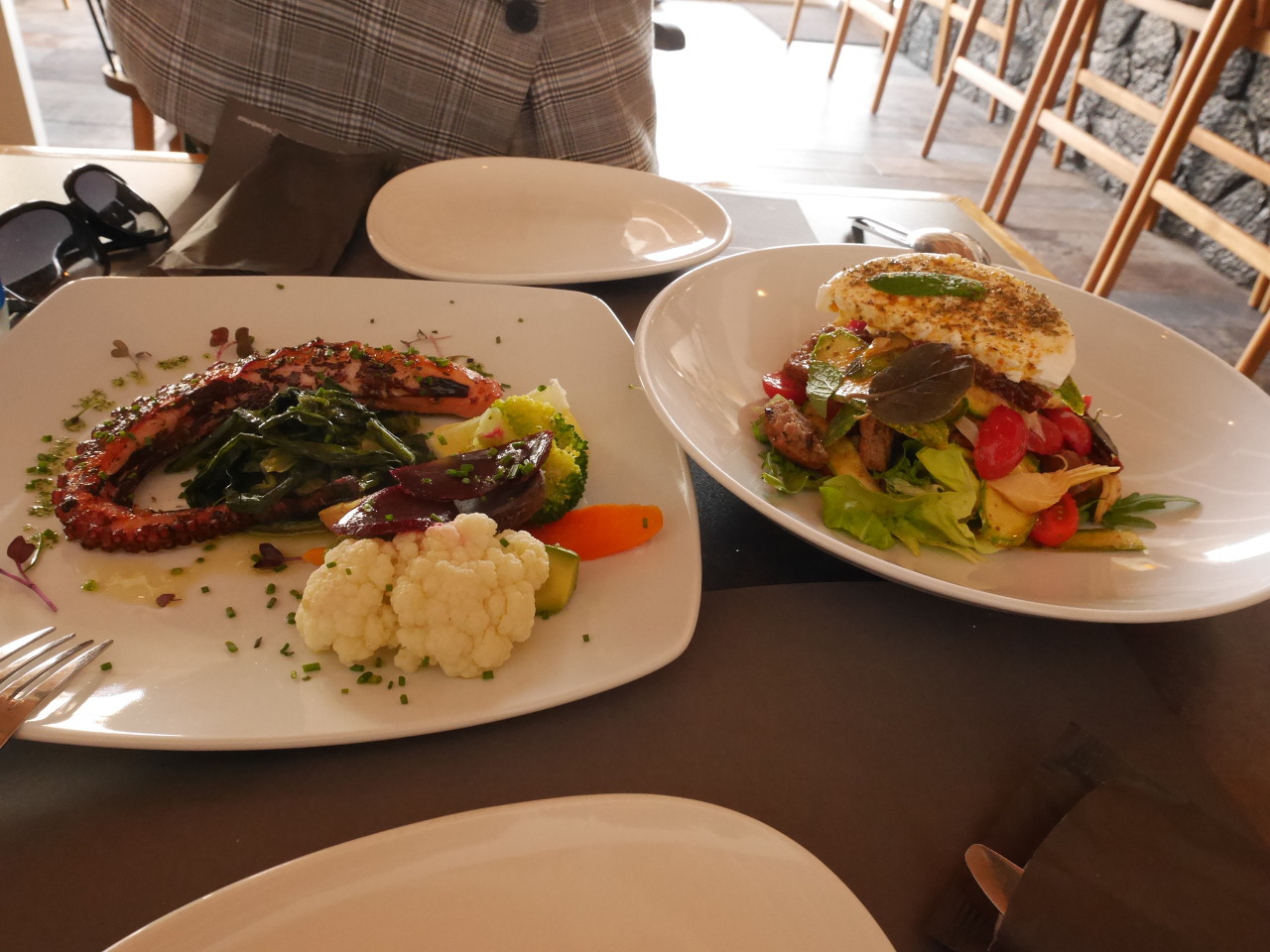 문어 다리와 샐러드. 물 1병 (48유로)를 시켰다.
