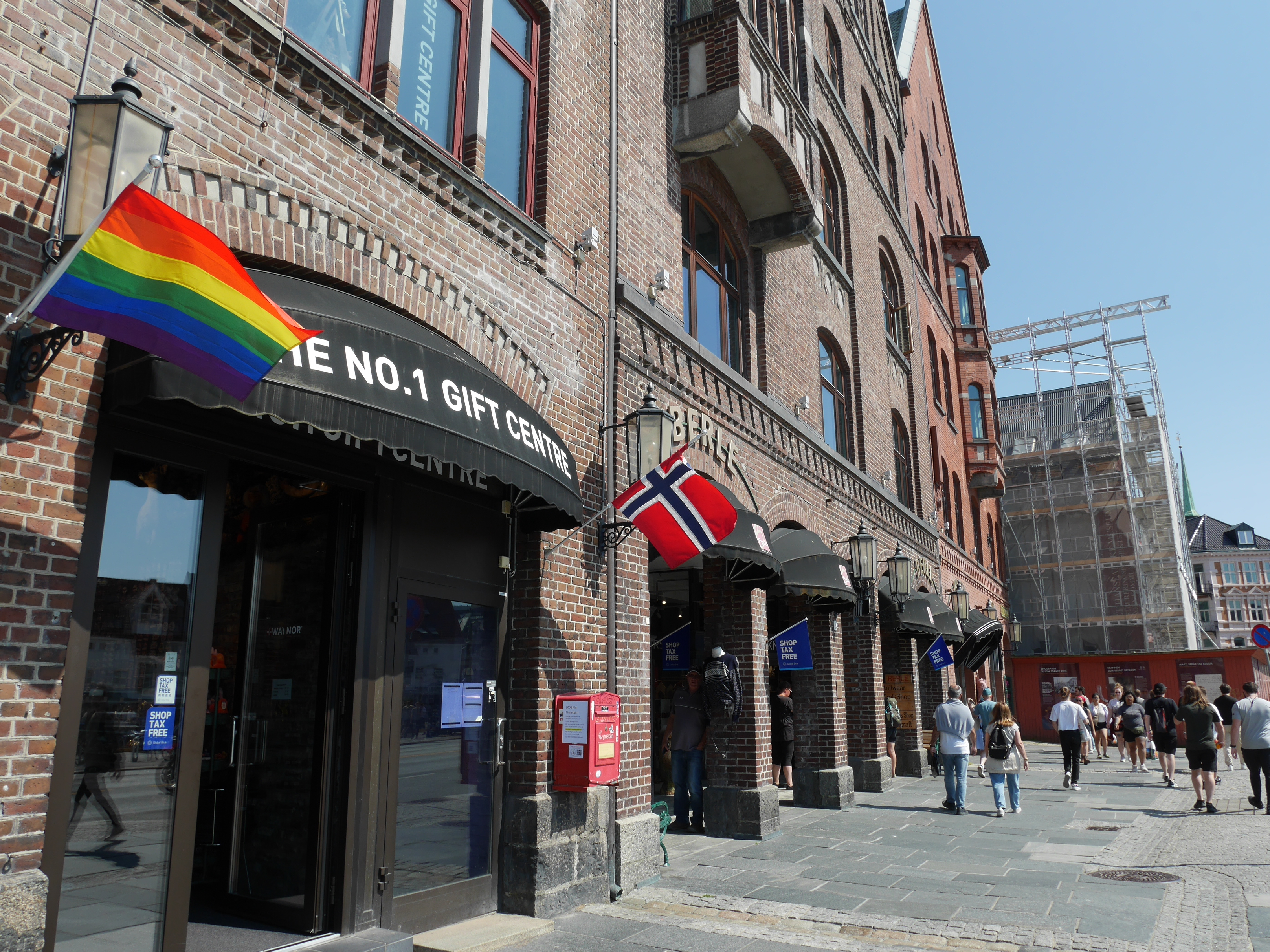 가념품 가게 앞에 나부끼는 노르웨이 국기와 동성애 깃발