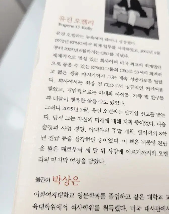 책의 후반부로 갈수록 오켈리는 자신에게 닥친 죽음을 두려움이 아닌 삶을 되돌아볼 수 있는 기회로 받아들입니다.
