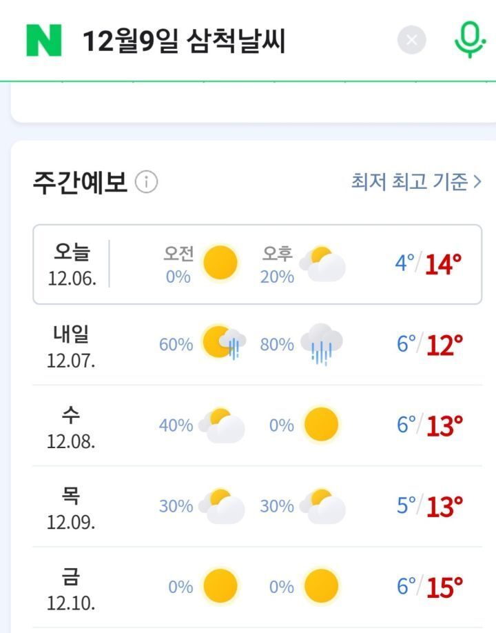 * 여행기간중 삼척 날씨는 최저 5 ~ 6도 최고 13 ~ 15도입니다 참고하세요