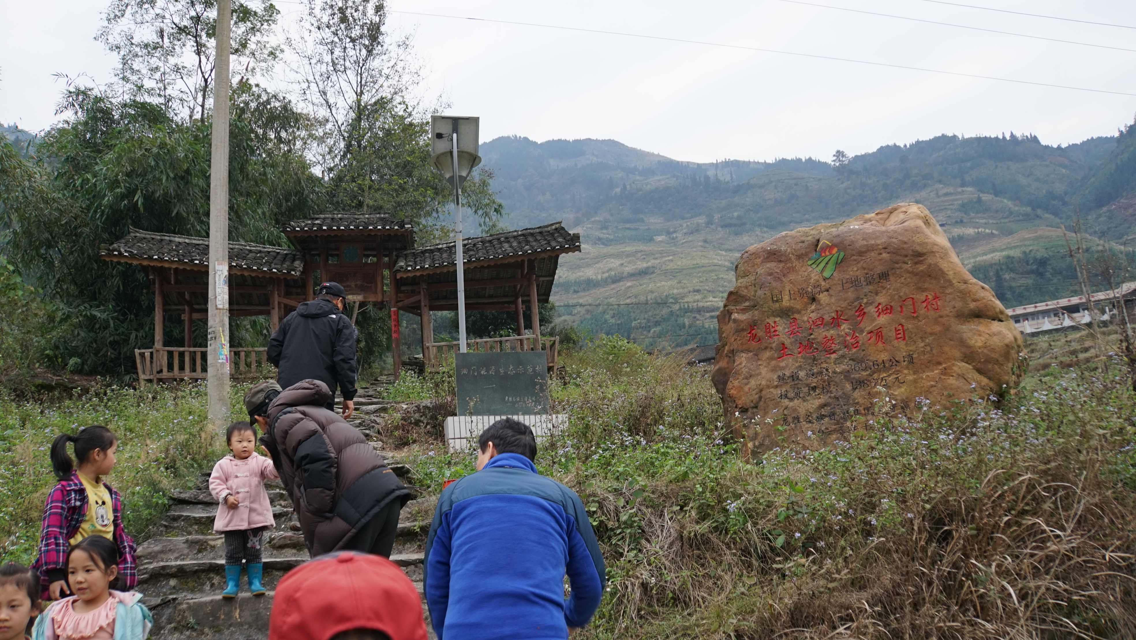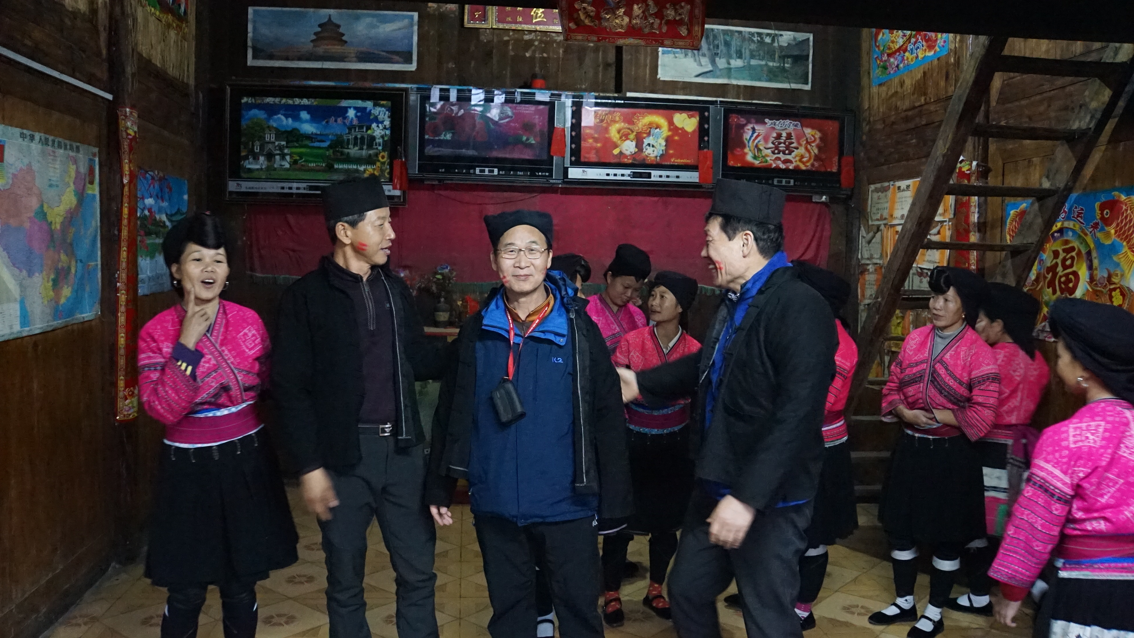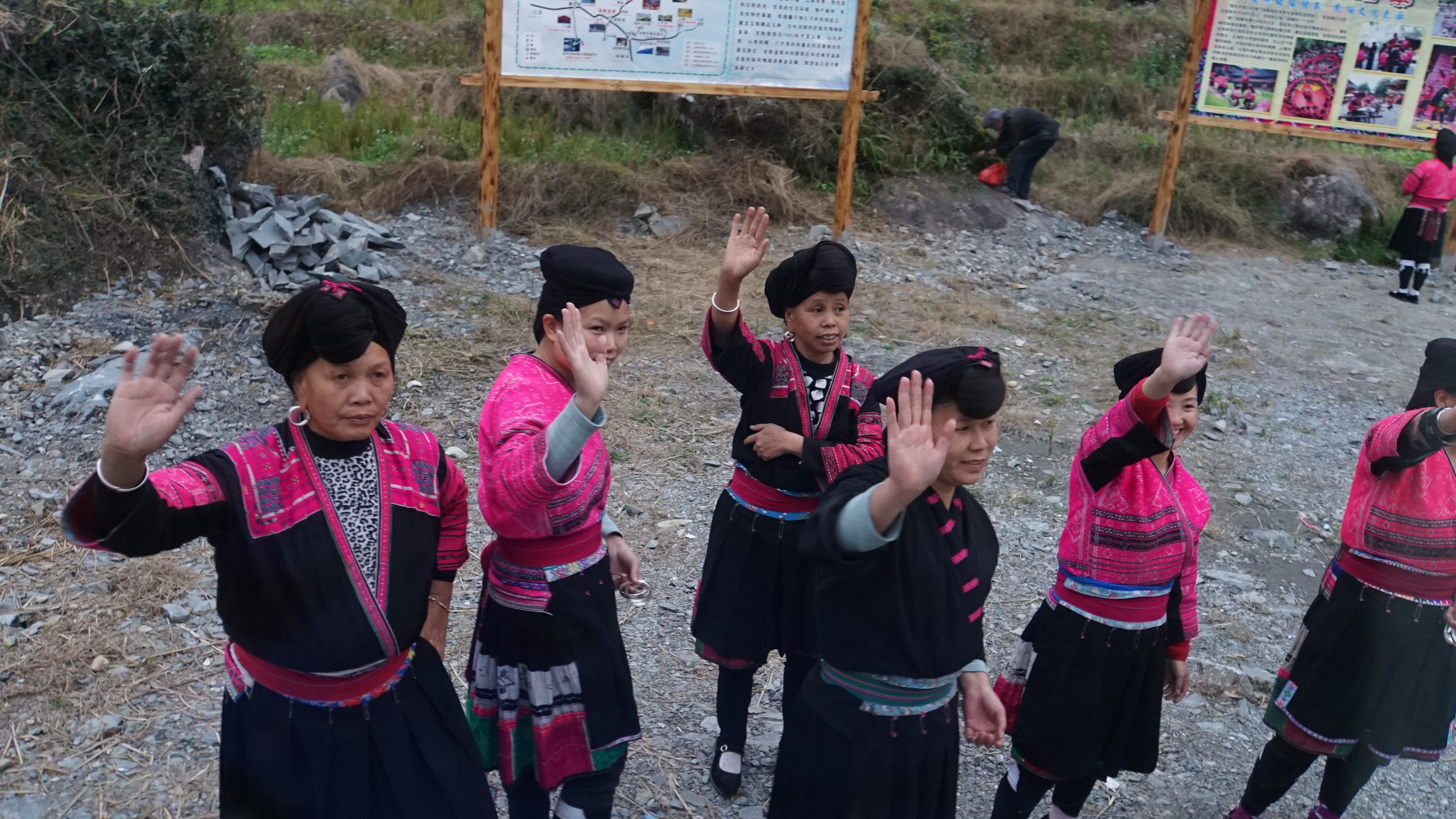 환영노래를 불러주고...가운데 있는 아주머니가 제일 예쁜 듯... 마을 입구 간판옆에 사진을 찍은 사람이다.