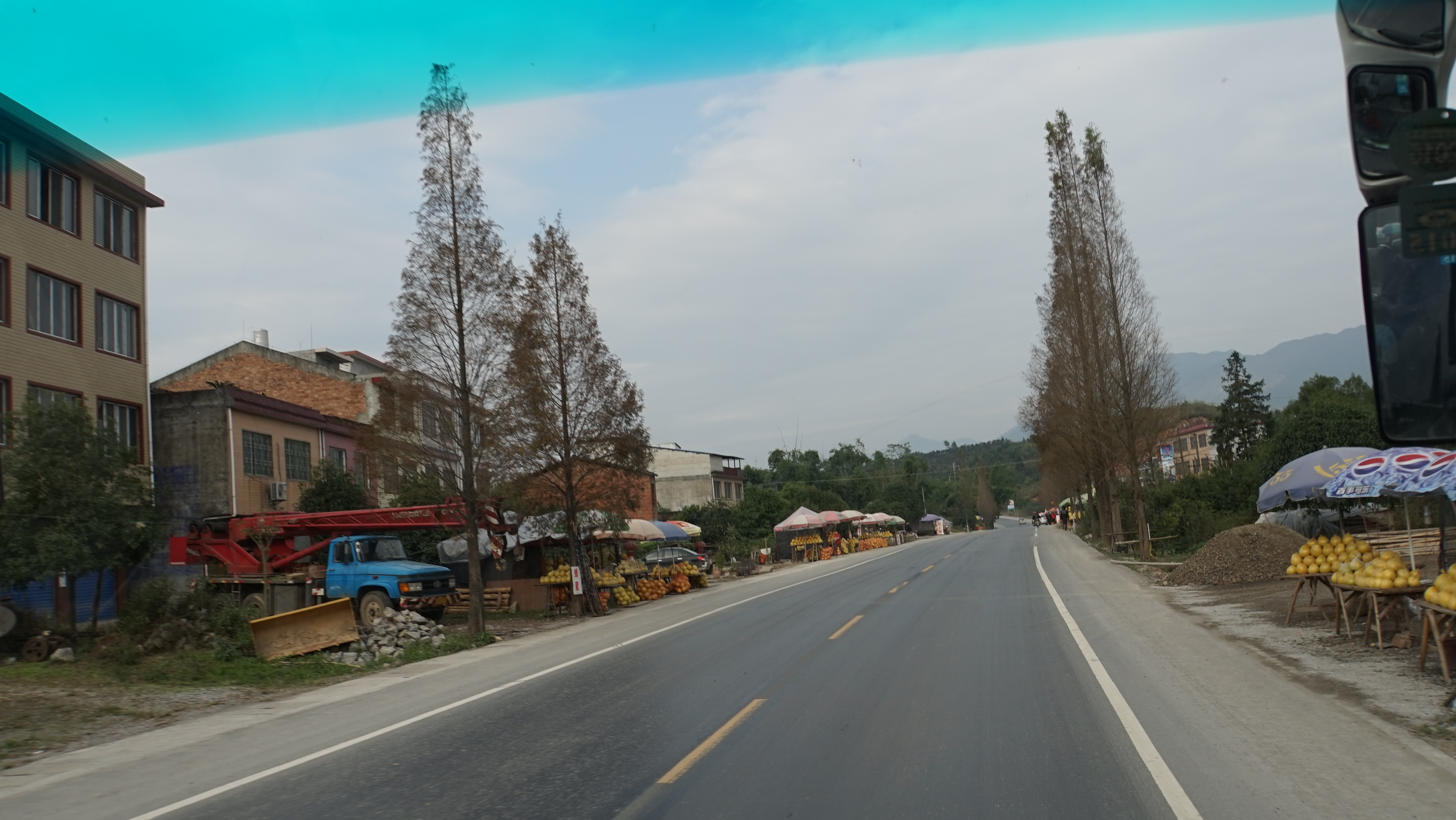 길가에 과일을 파는 파라솔이 보인다.