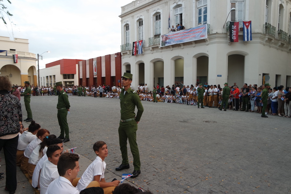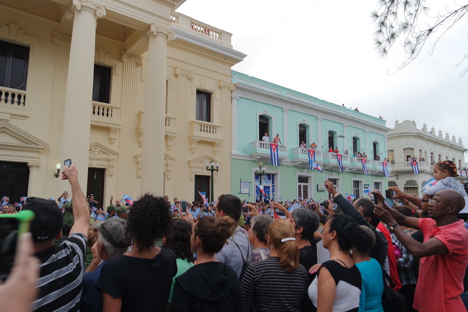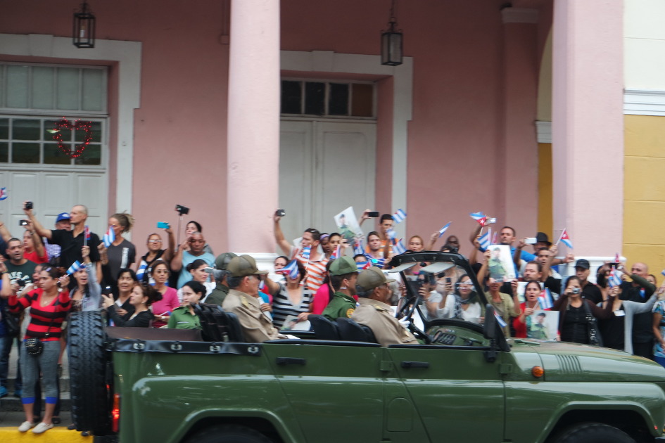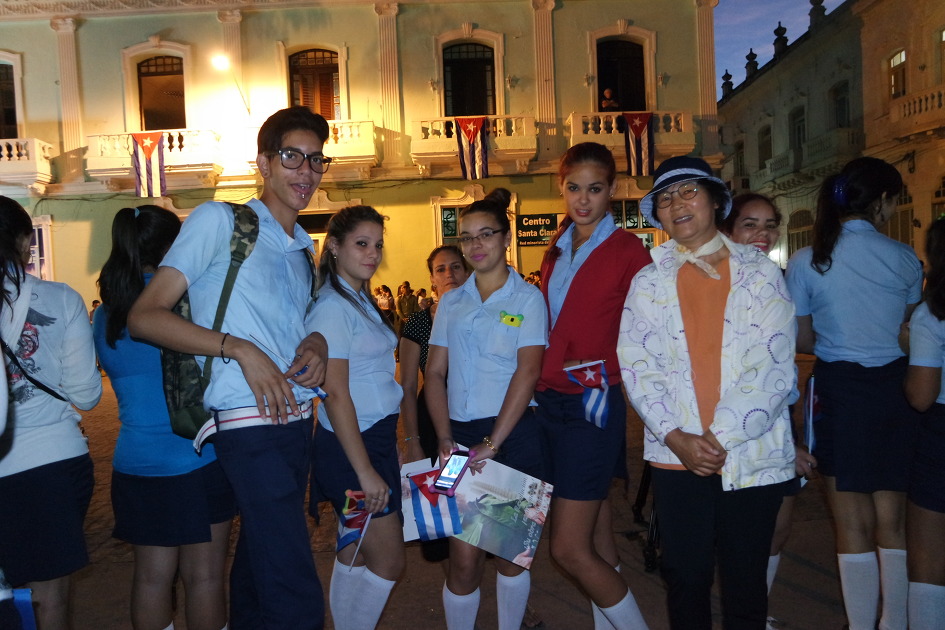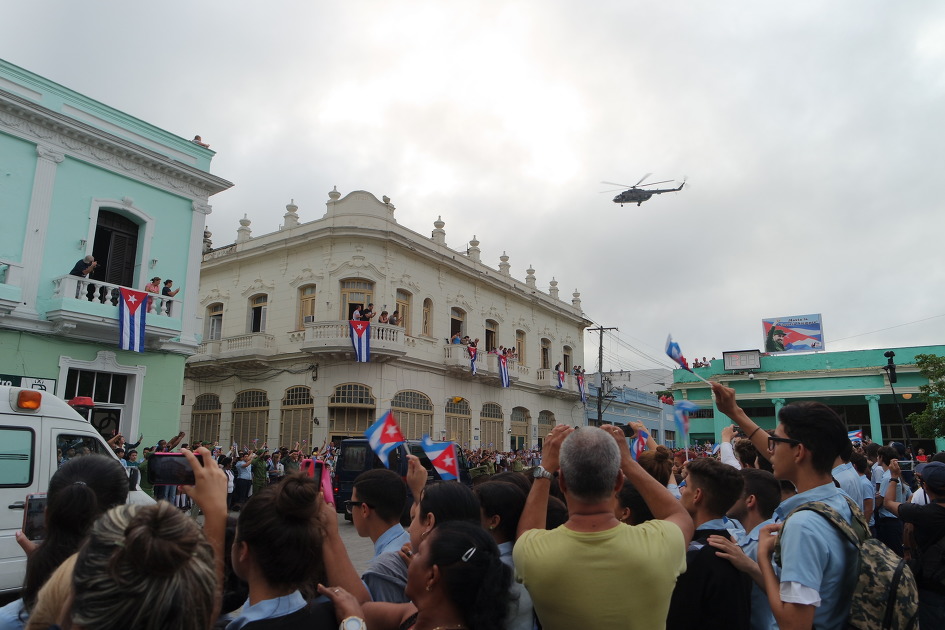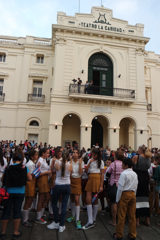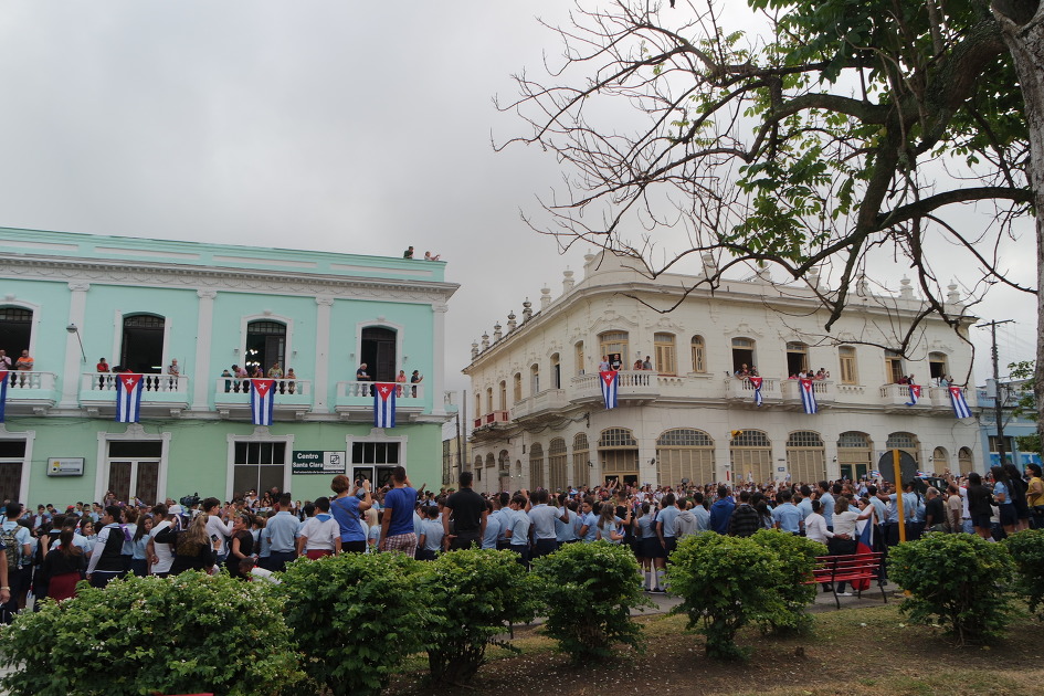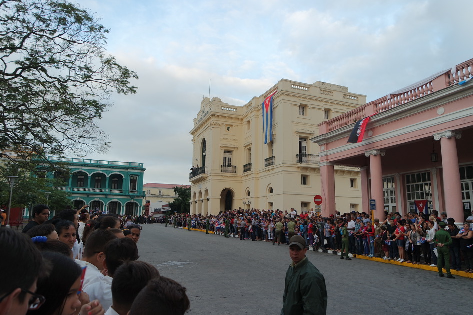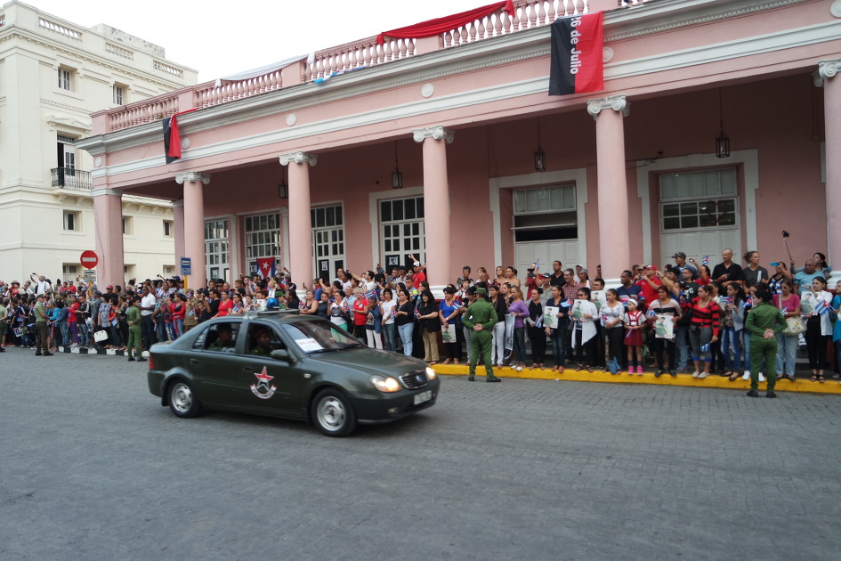 교복을 입은 학생들은 쿠바의 국기를 들고 도로변에 줄지어 서서 기다렸다.