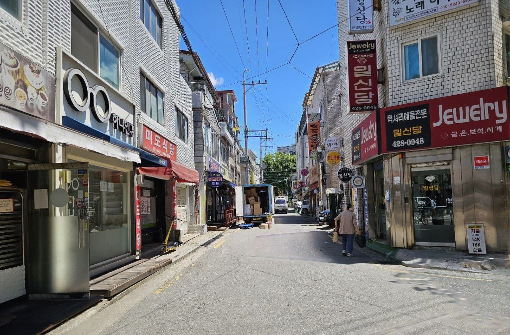 이 골목 끝에 식당이 있습니다