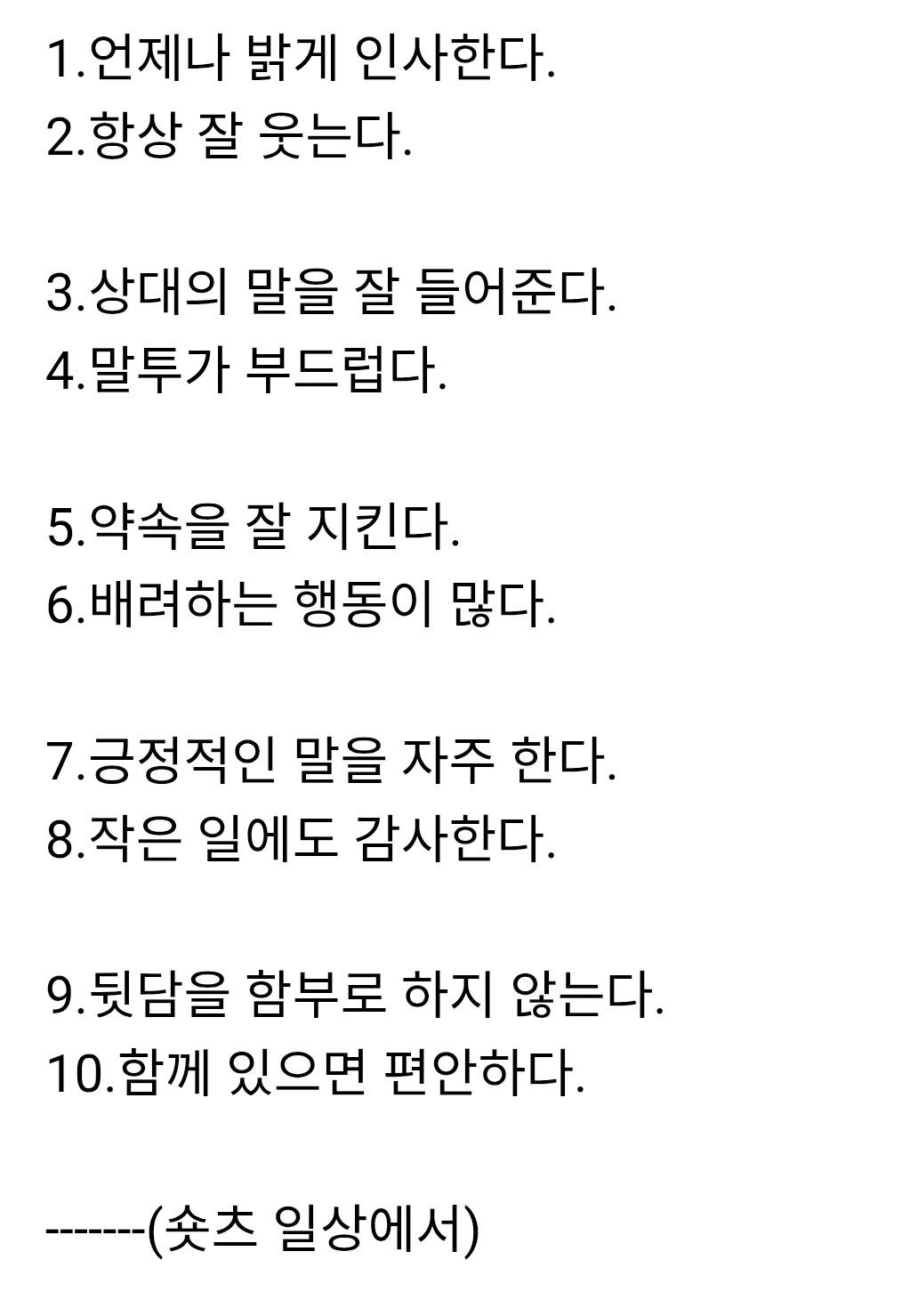 호감형 사람의 특징 작성자이정민|작성시간26.03.22|조회수127 목록 댓글 8 글자크기 작게가 글자크기 크게가 사랑하는 잔친들 우리모두도 호감형 특징배워서호감형 사람으로 거듭납시다~^^♡ 다음검색 현재 게시글 추가 기능 열기 북마크 공유하기 신고 센터로 신고 댓글 댓글 8 댓글쓰기 답글쓰기 댓글 리스트 답댓글 작성자이정민 작성자 본인 여부 작성자 | 작성시간 26.03.22 찬수 민들래 캐와서 무치고 부침개부치고 옆집언니와 잘 먹었어요~^^민드래캐서 꼭드세요~쓰지도 않고 감칠맛 나요~^^ 이미지 확대 답댓글 작성자찬수 | 작성시간 26.03.22 이정민 저도 먹고 싶네요 ㅎㅎ 답댓글 작성자이정민 작성자 본인 여부 작성자 | 작성시간 26.03.22 찬수 눈요기만 하세요~민들래보면캐세요~민들래는 만병통치약이요~^^ 이미지 확대 작성자빛 나 | 작성시간 26.03.22 늘 좋은글 많이 올리느라 수고많아요마음에 잘 새깁니다 답댓글 작성자이정민 작성자 본인 여부 작성자 | 작성시간 26.03.22 감사합니다~^^요즘 민들래 쓰지도 않고 달짝하네요~^^♡ 이미지 확대 댓글 전체보기
