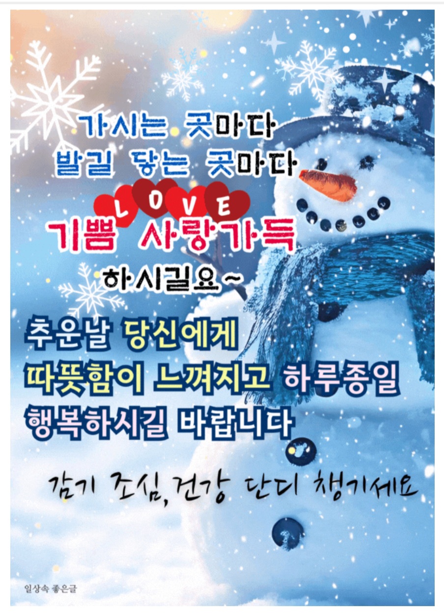 날씨가 많이 추워졌습니다.. 옷 단단히 입으세요. 작성자테리우스7|작성시간24.11.28|조회수121 목록 댓글 2 글자크기 작게가 글자크기 크게가 다음검색 현재 게시글 추가 기능 열기 북마크 공유하기 신고 센터로 신고 댓글 댓글 2 댓글쓰기 답글쓰기 댓글 리스트 작성자인택 | 작성시간 24.11.28 테리 친구도 야무지게 입고 다니시길...ㅎ^^ 작성자예그리나 | 작성시간 24.11.29 추운 겨울 친구들 모두 건강조심하세요 댓글 전체보기