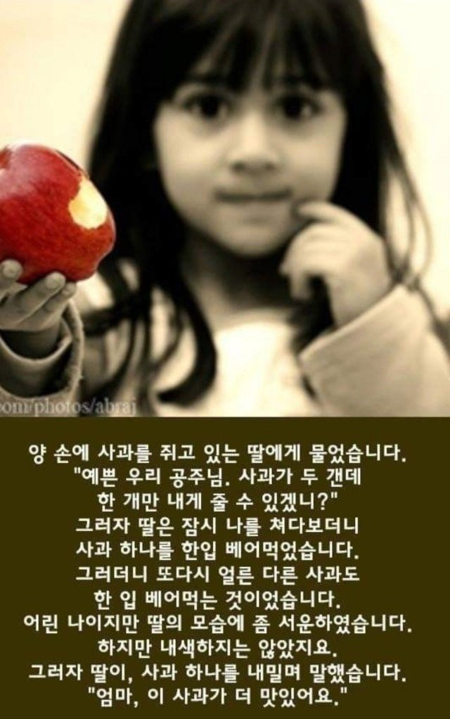이유가 있었던 딸의 행동 작성자봉서방|작성시간22.04.12|조회수125 목록 댓글 2 글자크기 작게가 글자크기 크게가 다음검색 현재 게시글 추가 기능 열기 북마크 공유하기 신고 센터로 신고 댓글 댓글 2 댓글쓰기 답글쓰기 댓글 리스트 작성자음유시인 | 작성시간 22.04.13 더 달고 맛있는 사과를 엄마에게 주기위해... 작성자신포도 | 작성시간 22.04.13 사랑스러운 딸의 모습.. 소중한 우리들의 어릴적 모습입니다. 댓글 전체보기