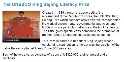 ▶1989년 유네스코 문맹퇴치 공로상인 `세종대왕상` 창설