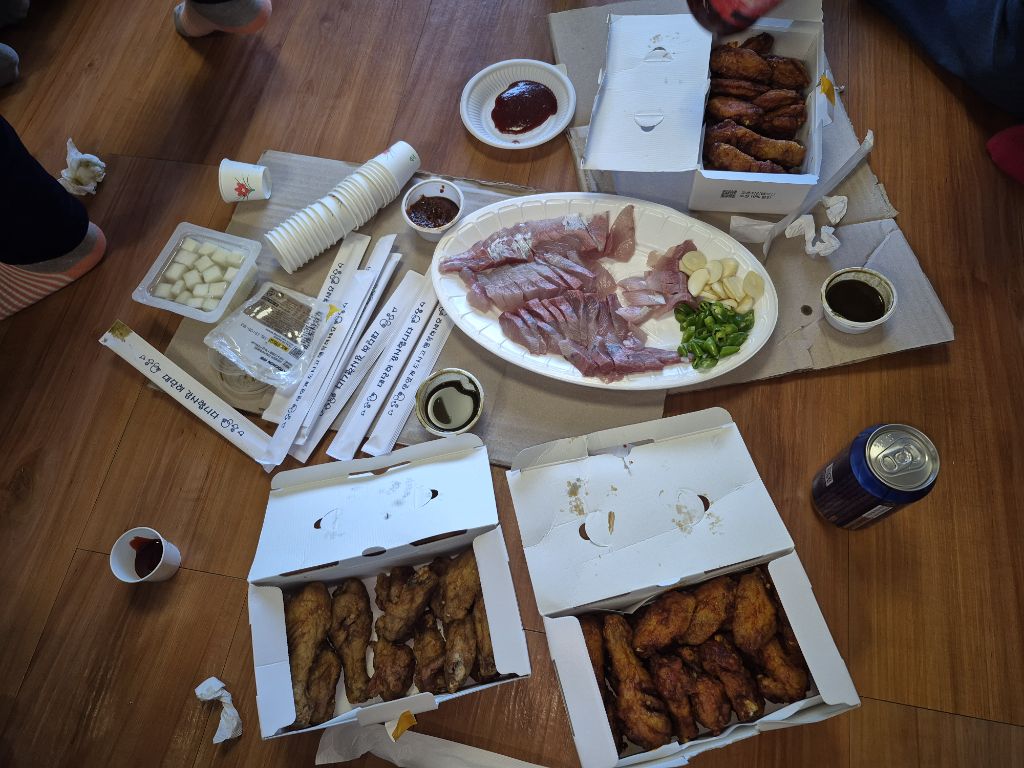 콘도에 도착해서~방어회와 치킨으로 우선 반주 한잔합니다.