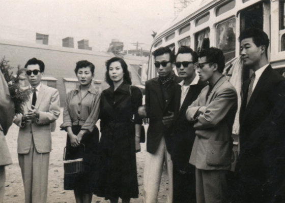 ▲ 박춘석 사단의 멤버들과 함께 공연길에서 한 컷. 좌로부터 안다성, 한사람 건너 이해연, 박춘석, 손인호, 맨 우측이 최갑석. 1958년