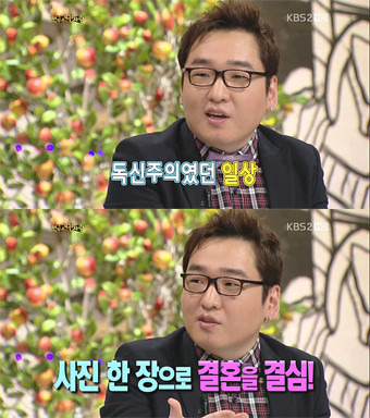 윤일상은 아내의 사진만 보고 결혼을 결심했다고 밝혀 눈길을 끌었습니다. 이날 함께 출연한 김연우는 자신이 결혼할 당시 윤일상이 "결혼을 왜 하느냐"고 물을 정도로 결혼에 회의적이었는데 한 달 뒤쯤 여자친구라며 사진을 보여줬다"고 폭로했습니다.
