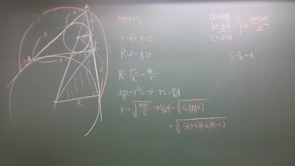 이것들을 종합하여 내접원의 반지름을 구할 수 있고 헤론의 공식으로 확장이 가능합니다.