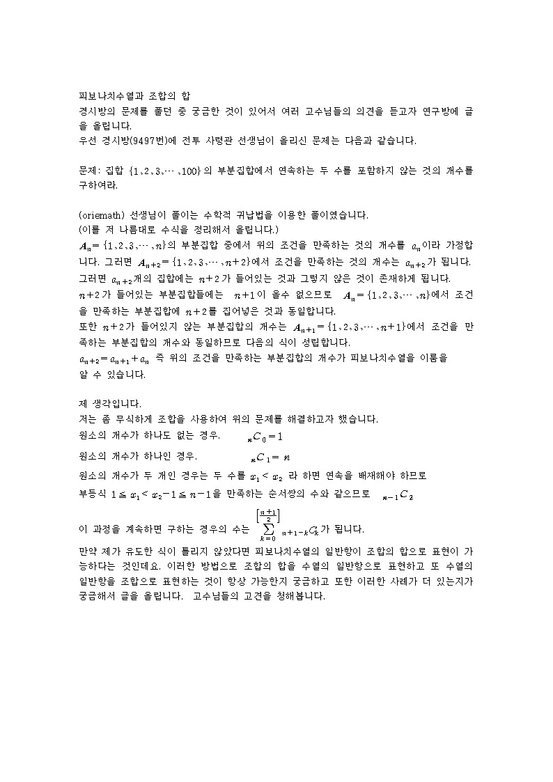 작성자해~밀 작성시간 12.11.26 계차수열에서 계차가 다항함수인 경우는 조합으로 풀어놓은 것이 예전 해법실력수학에 소개가 나와 있었죠....지금 생각해 보면 생성함수 사용해서 만들어 둔것 같군요....그리고 계차가 등비인 경우는 조합으로 표현하지 못할 것 같은데요...^^
