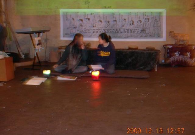보따리 학교 학생인 오름이(창원)일본인과 공연 연습 대본을 읽고 있습니다..