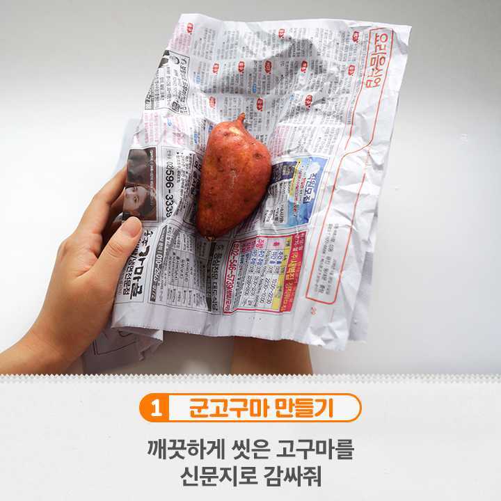 깨끗하게 씻은 고구마를 신문지로 감싸주세요.