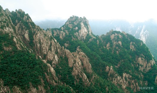 중생대 백악기에 관입한 화강암이 침식을 받아 수려한 능선을 이루고 있는 설악산 공룡능선 전경