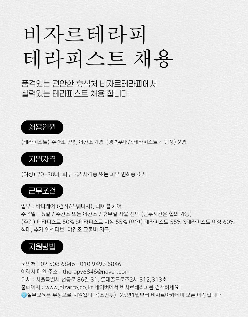 선릉비자르💕 주-야간 여성 관리사 채용합니다! (야간급구 : 꾸준히 손님 많은 샵⭐) 작성자테라피테라피|작성시간24.12.21|조회수12 목록 댓글 0 글자크기 작게가 글자크기 크게가 다음검색 현재 게시글 추가 기능 열기 북마크 공유하기 신고 센터로 신고 댓글 댓글 0 댓글쓰기 답글쓰기 댓글 리스트