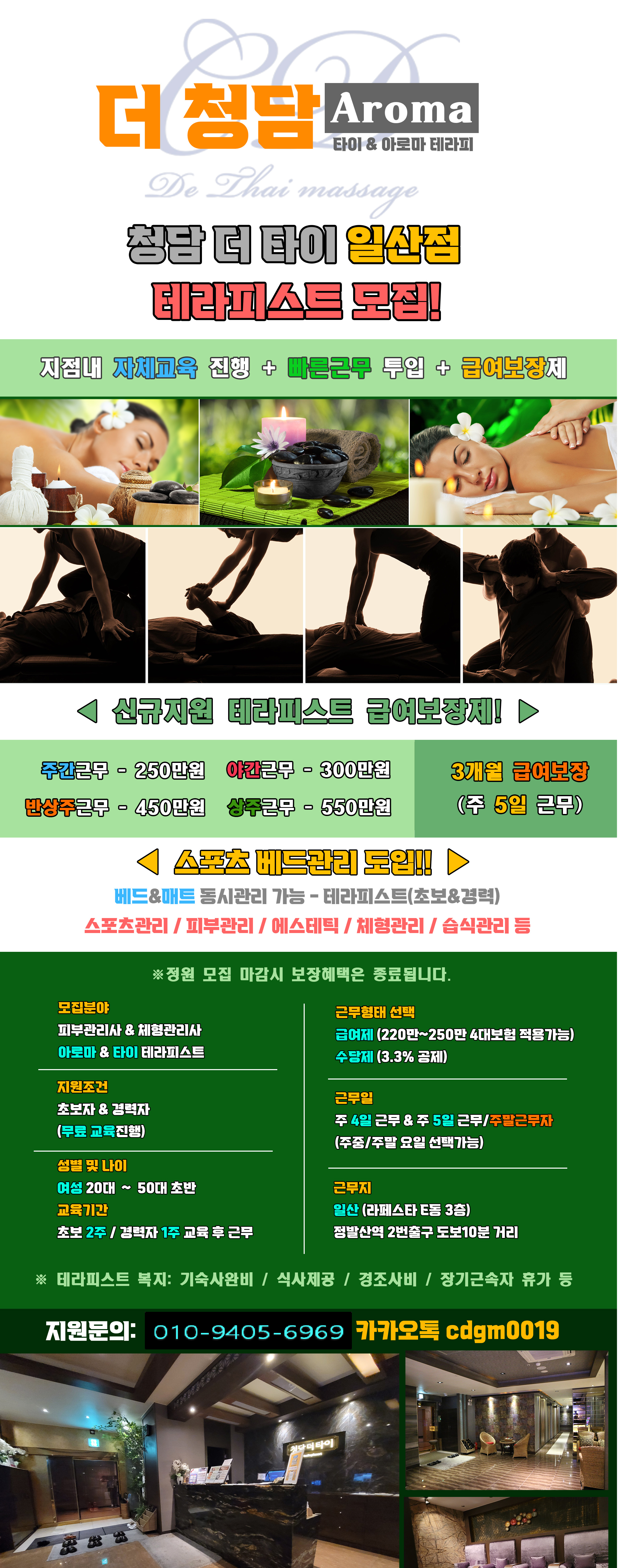◆◆ 주 4일 근무제 " 청담더타이 일산점 " 관리사 선생님(여) 모집합니다 ◆◆ 작성자청담일산|작성시간26.04.28|조회수8 목록 댓글 0 글자크기 작게가 글자크기 크게가 다음검색 현재 게시글 추가 기능 열기 북마크 공유하기 신고 센터로 신고 댓글 댓글 0 댓글쓰기 답글쓰기 댓글 리스트
