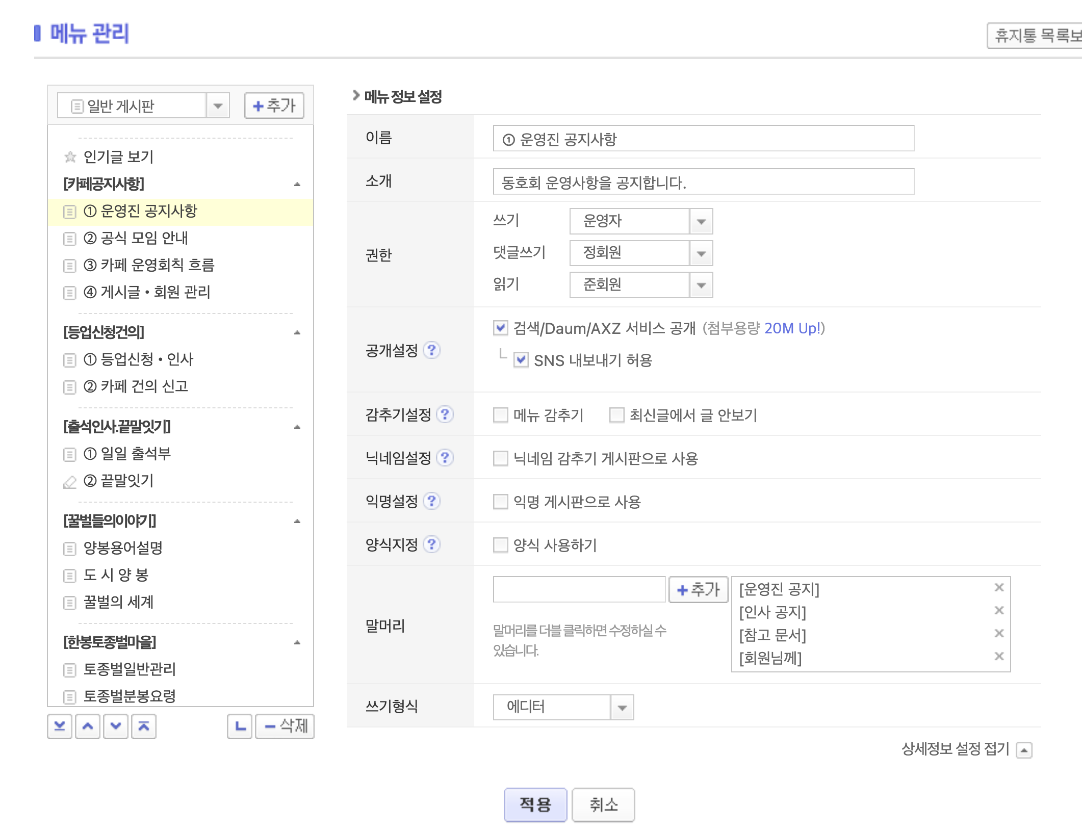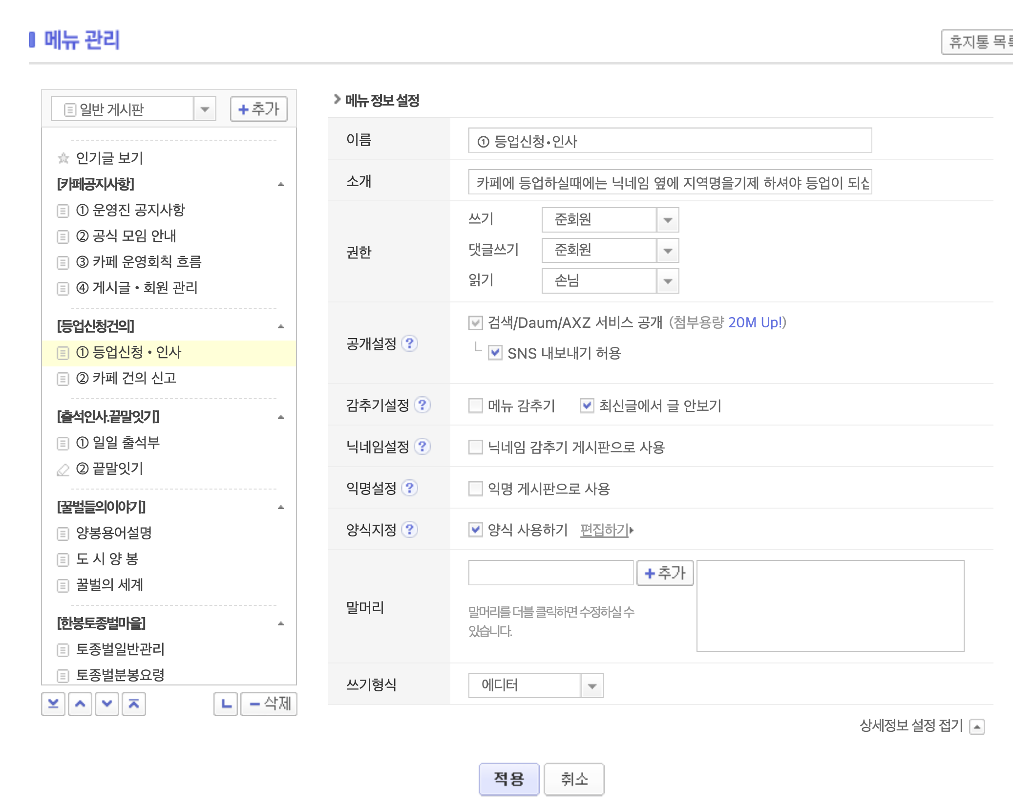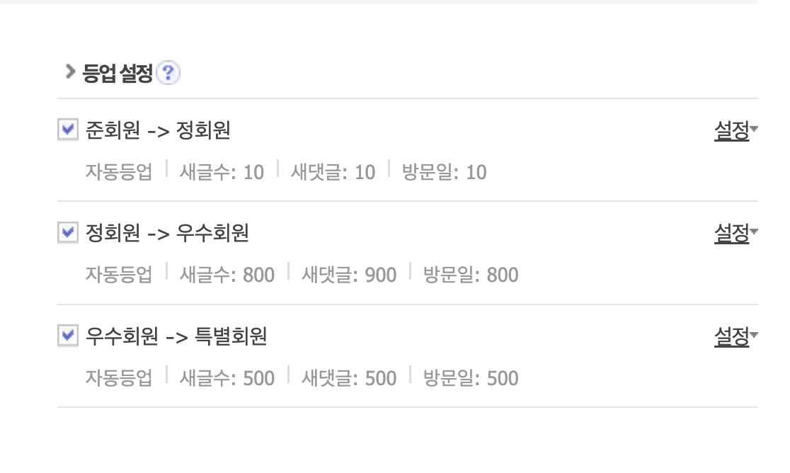 제가 이해한 바로는 카페 운영에 있어서 [정회원 그 이상의 상위등급설정]의 목적은 게시판별 권한 구별에 있는 것입니다.