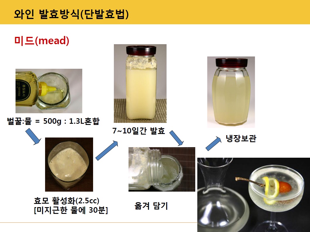 벌꿀술은 효모의 영양성분 부족으로 잔당이 많아 달콤하고, 미세한 후발효가 일어나 청량감이 있는 술로 비교적 간단한 방법으로 양조의 원리를 이해하는데 좋습니다.