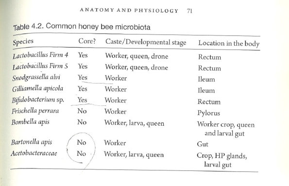 벌통 내 존재하는 미생물은 꿀벌의 후장(hindgut)에 까지 영향을 준다.
