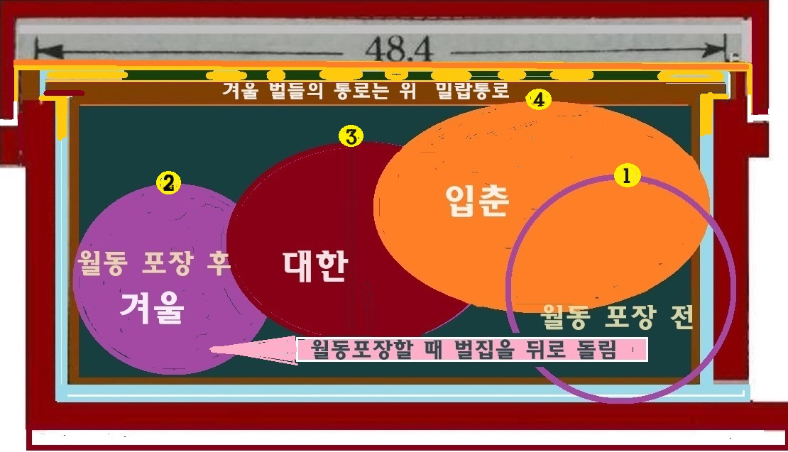 월동 포장할 때 벌집을 돌려서 깊숙이 형성되게 하면 뒤쪽에서 안정되게 겨울을 나고 소한 대한 입춘을 지나면서 먹이를 소모하면서 위쪽으로 올라옵니다. 예외도 있지만 대개의 벌은 그림과 같이 봉구가 변합니다. 온도에 따라 봉구는 크기가 달라지고 바깥쪽 벌들은 속으로 파고들며 겨울을 납니다. 약군을 덧통으로 두면 먹이를 두고도 굶어죽는 일이 일어날 때가 있습니다.