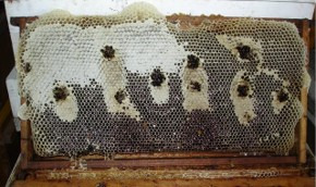 자동공간 (Self Spacing Frames) 을 두지 않고 벌집을 붙였을 때의 덮개 덮은 벌집