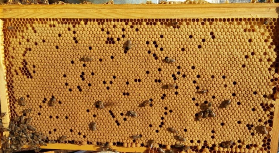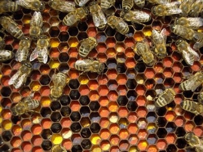 꽃가루장 (화분소비 花粉巢脾, 화분판花粉板) → 꿀벌이 뒷다리에 뭉쳐온 꽃가루는 벌방에 털어넣고 다진다. 꽃가루가 든 벌방이 주로 있는 벌집
