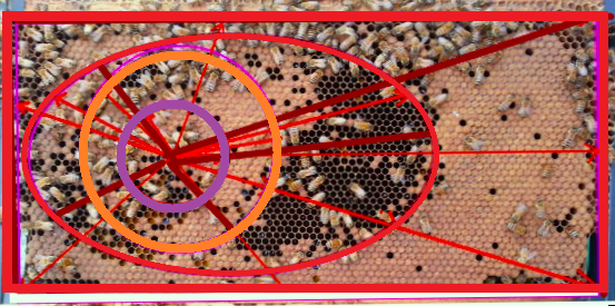 알낳는 구역 (산란권 産卵圈) → 벌집의 알낳고 애벌레 기르는 구역이 벌집의 위치에 따라 원형과 반달형과사각형이 되는데타원형산란 이 보통인데 계속 커지다 보면 벌집의 끝까지 확대되어 벌집 크기와 같은 모양의 사각형이 된다. 주어진 사각형 안에 들어가는 가장 큰 타원을 그리면 모서리는 타원 영역이 아니다. 즉, 타원 모양의 알낳는 구역이라면 비어있을 곳이 귀산란이라면 차게 되는 것을 의미한다. 직사각형벌집에 들어가는 가장 큰 타원의 면적은 해당 직사각형 면적의 75% 정도이다.