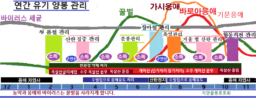 바이러스 → 꿀벌에는 약 20종의 바이러스가 있다. 이산화염소수( )와 미산성염소산수(HOCL) 소독이 필요하다.