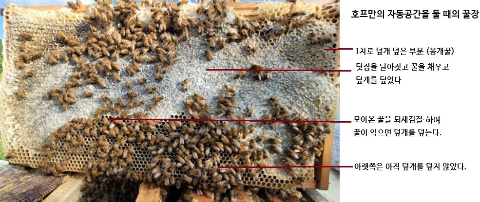 덮개 (밀개 密蓋) → 일벌은 꿀이 많이 들어오고 숙성되면 덮개를 덮는다. 벌집과 벌집 사이를 8mm정도 벌려두면 덧집을 짓고 꿀을 더 많이 채우며 늦게 꿀 덮개를 덮고 꿀이 좋아진다. 덮개를 덮으면 일벌이 필요 없고 열만 필요하므로 덮개 덮지 않는 곳에 일벌이 붙어서 일한다.