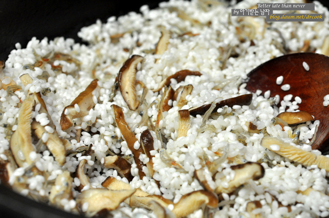 잘불려진쌀을 넣고 볶다가 준비한 버섯도 넣고 같이 볶아줍니다.