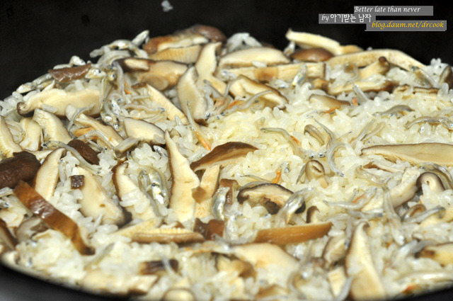 멸치만 넣고 밥을 하면 밋밋하기때문에 식감이 좋은 버섯을 같이 넣어주었답니다.