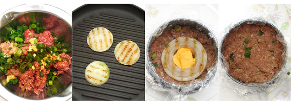 3. 패티 가운에 양파를 얹고 가운데 부분을 빼고 치즈를 살짝 넣었는데