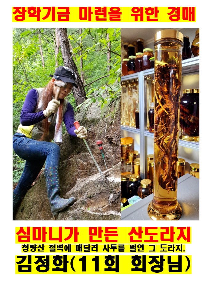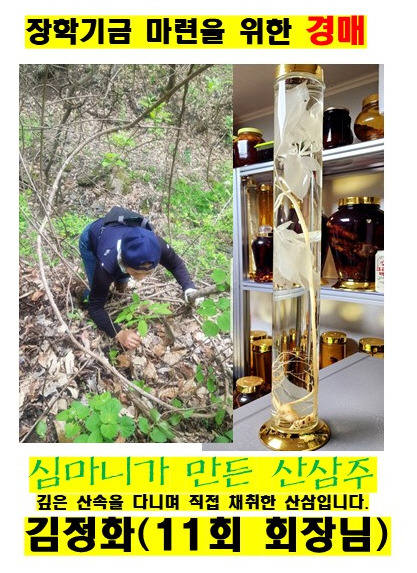 장학금 마련을 위한 기부이므로 경매 대상 물품입니다. 경매시작가는 산삼 30만원~ 도라지주 50만원~ 많은 응찰 바랍니다. 건강해지고, 장학금마련에 기여하고 꿩먹고 알먹고 감사합니다/.