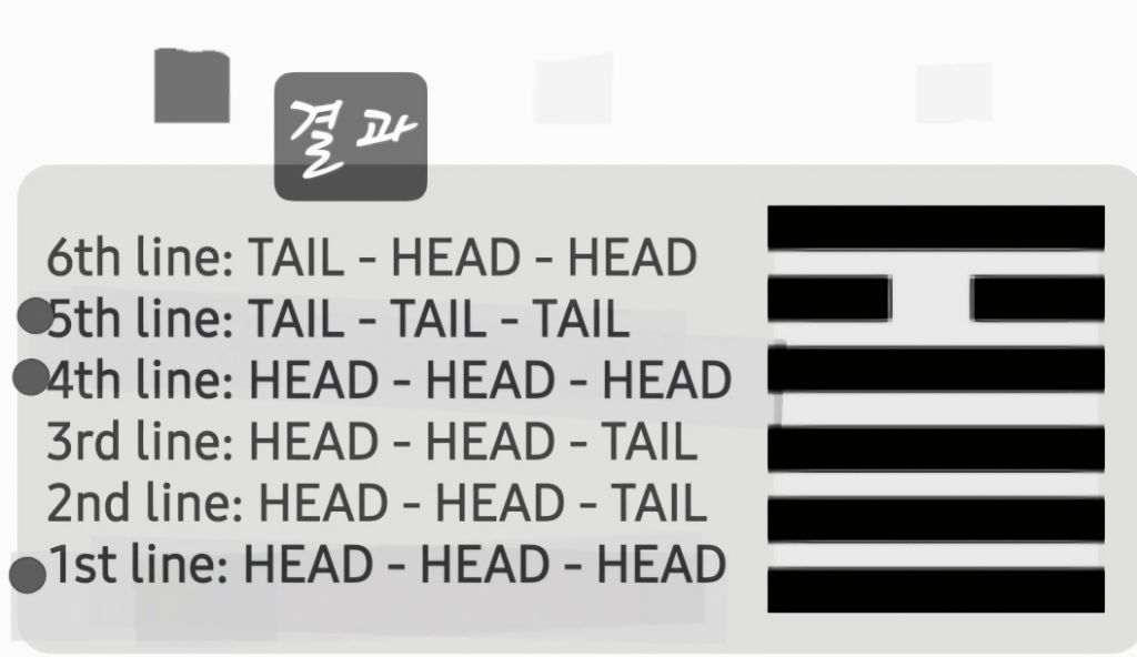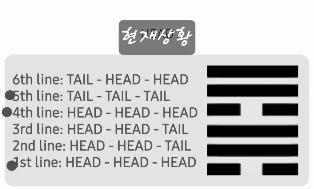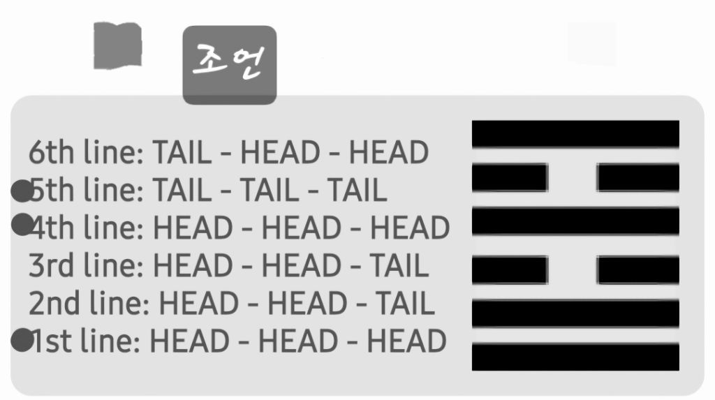 동전 3개를 6번 던집니다. 앞면을 양, 뒷면이 나오면 음, 동전이 2대1로 나오면 많은쪽의 양이나 음을 채택합니다.