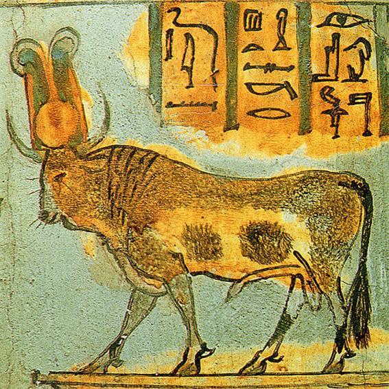 이집트의 21대 왕조의 한 관에 그려진 신성한 아피스 황소 상, BC 1000년 경 작품으로 추정된다. 출처: The Way to Eternity: Egyptian Myth by Fergus Fleming and Alan Lothian, p.68, 사진 Michael Holford.