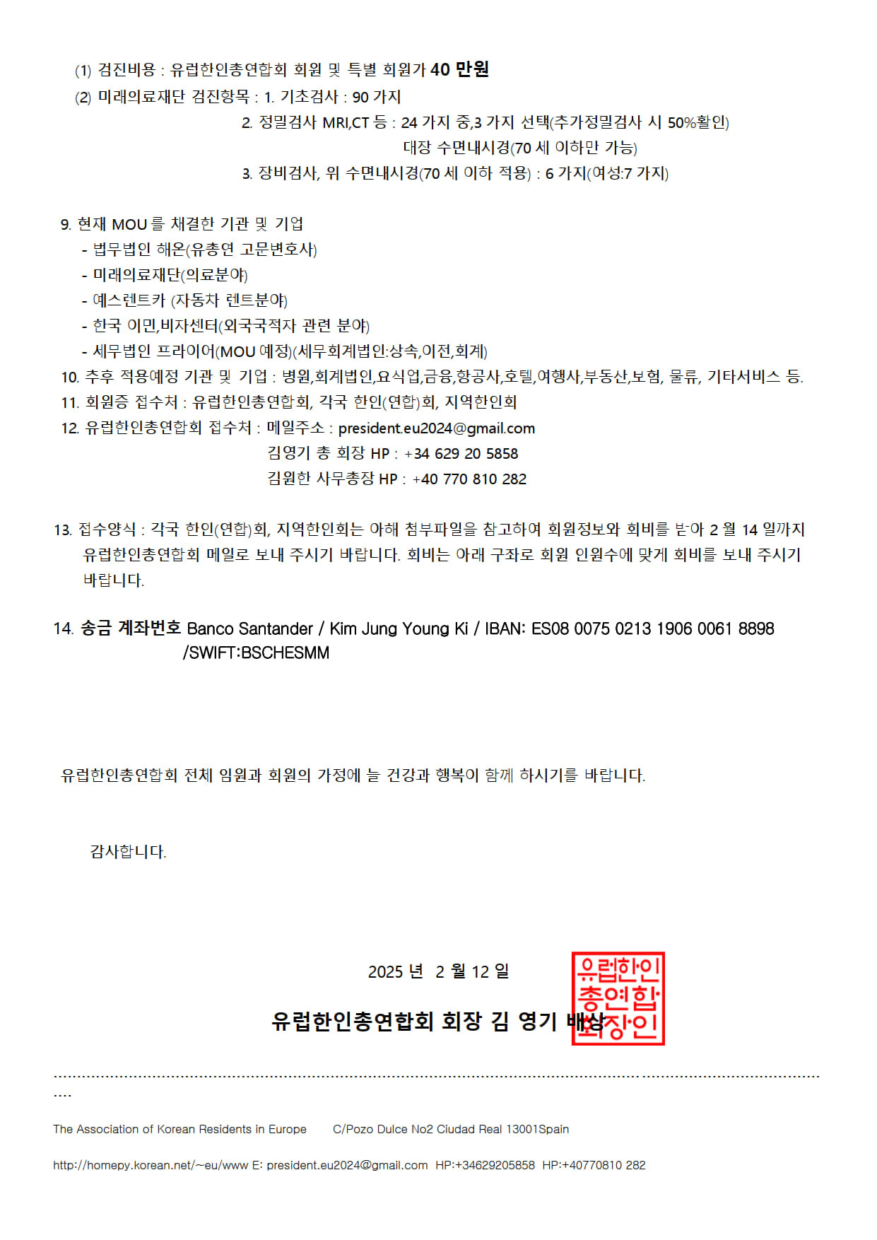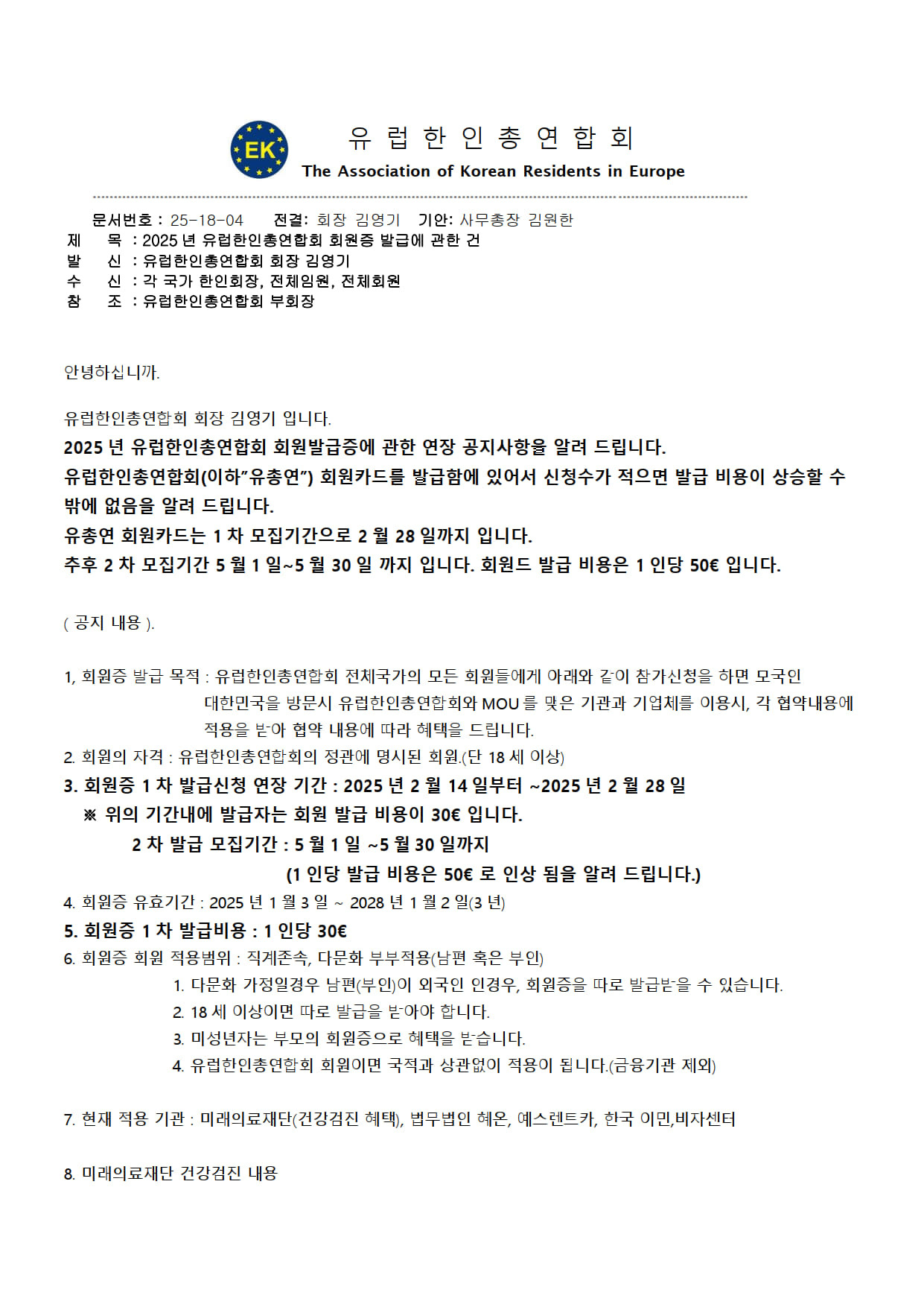 베른지역한인회 회원분 중에 유럽한인총연합회 회원증 발급을 원하시는 분들은 2월 28일까지 신청해 주시길 바랍니다.