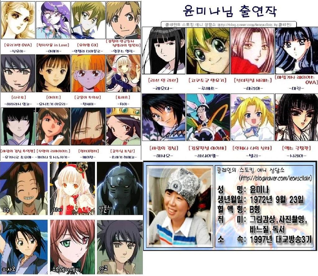 윤미나 님이 맡았던 역할들입니다. 가장 큰 사진은 기동전사 건담 시드에서 함장 라미아스 역...