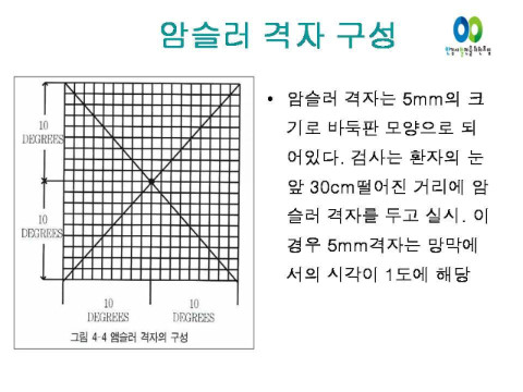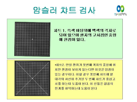 정확하게 그려진 암슬러 격자 시표를 사용하는 것이 좋겠지만 안질환의 의심을 하는 데는 크게