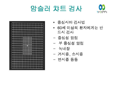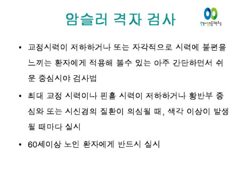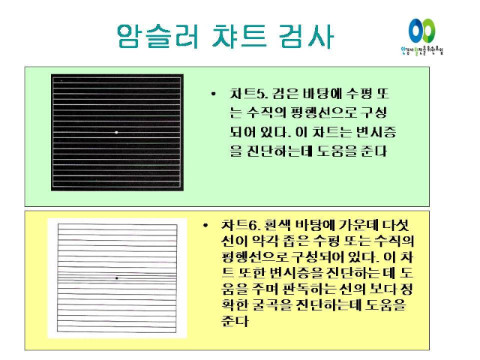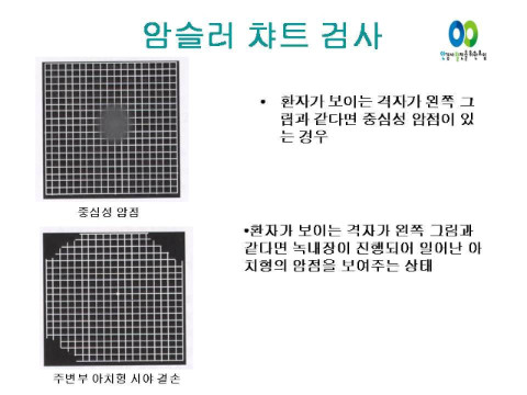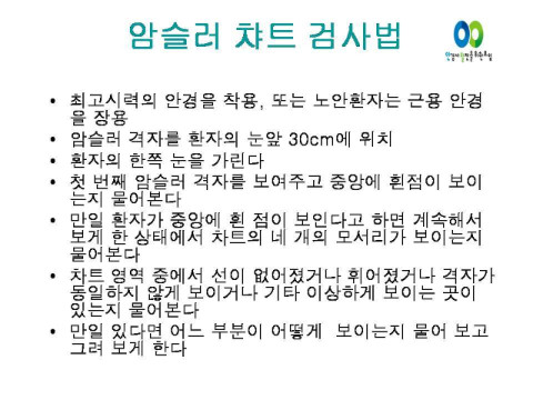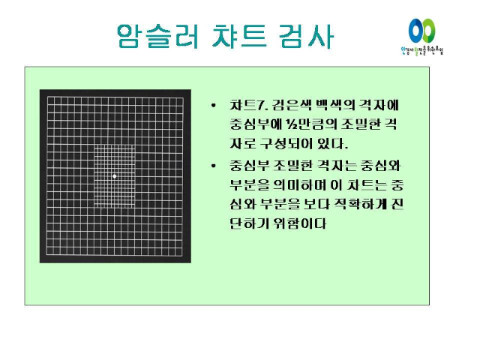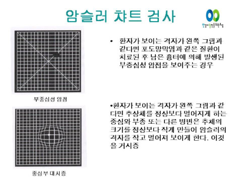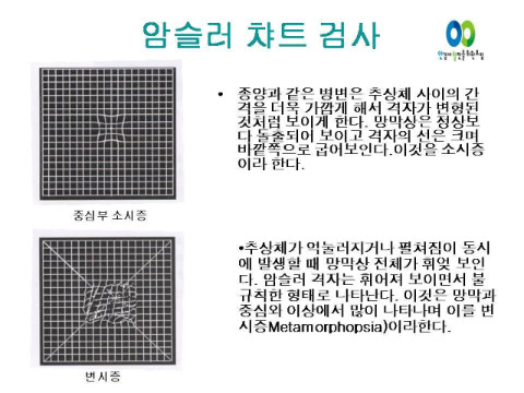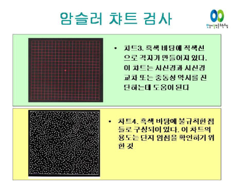 암슬러 검사시 문제가 발생이 된다면 안과 진료를 권유하는 것이 바람직 합니다.