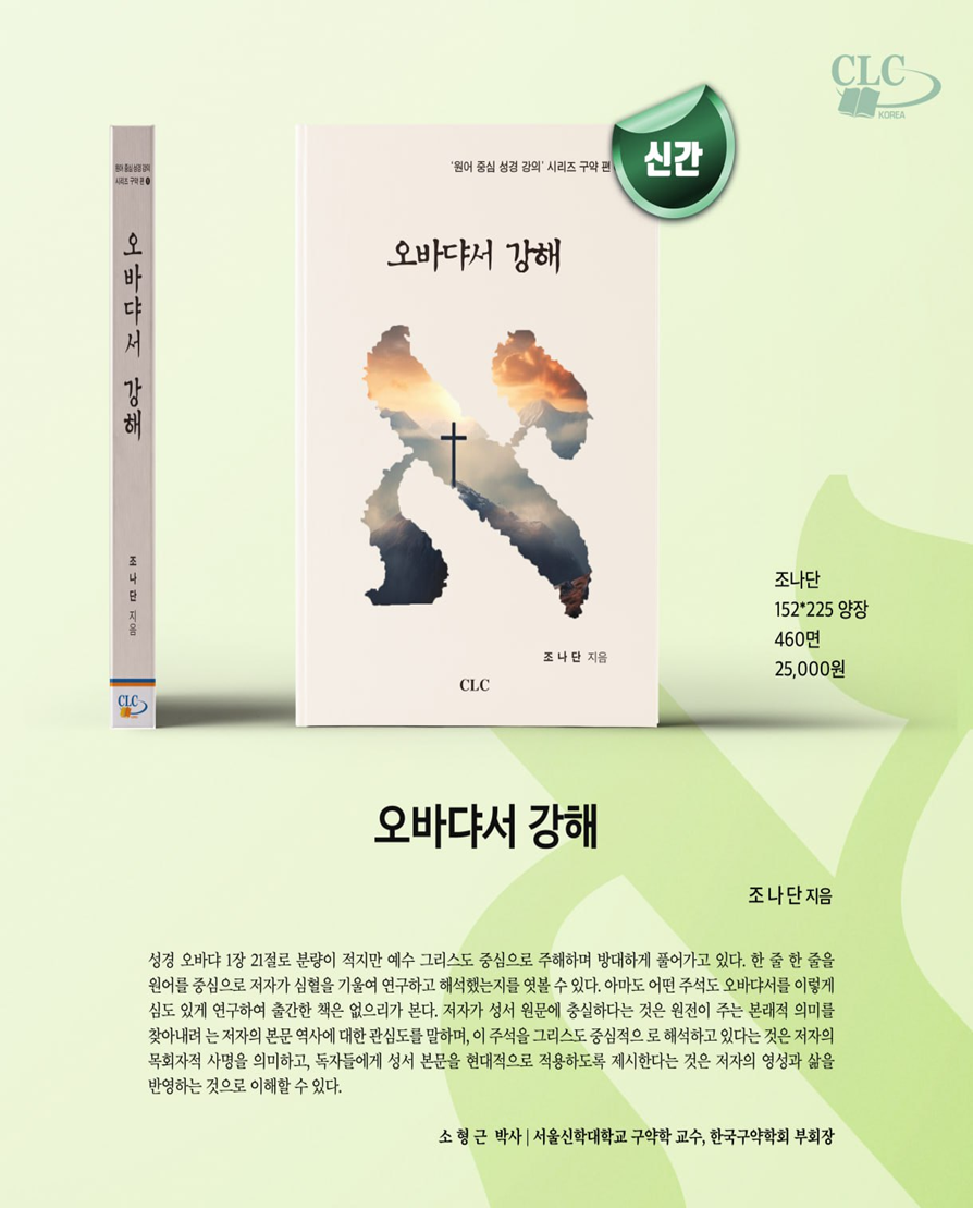오바댜서는 짧지만 깊은 내용을 담고 있어 신학자들과 목회자들이 주목해 온 성경입니다. 그 결과로 나온 것 같은 조나단 목사님의 『오바댜서 강해』에 는 예수 그리스도의 복음이 가득합니다. 성경의 핵심 중 핵심이라고 할 수 있 는 십자가 복음 이외에 다른 내용이 전혀 없습니다. 인본주의적인 누룩이 철 저히 배제되고, 오직 우리 주 예수 그리스도의 십자가 은혜만 가득 담겨 있어 마치 무교병 같은 느낌을 받습니다.