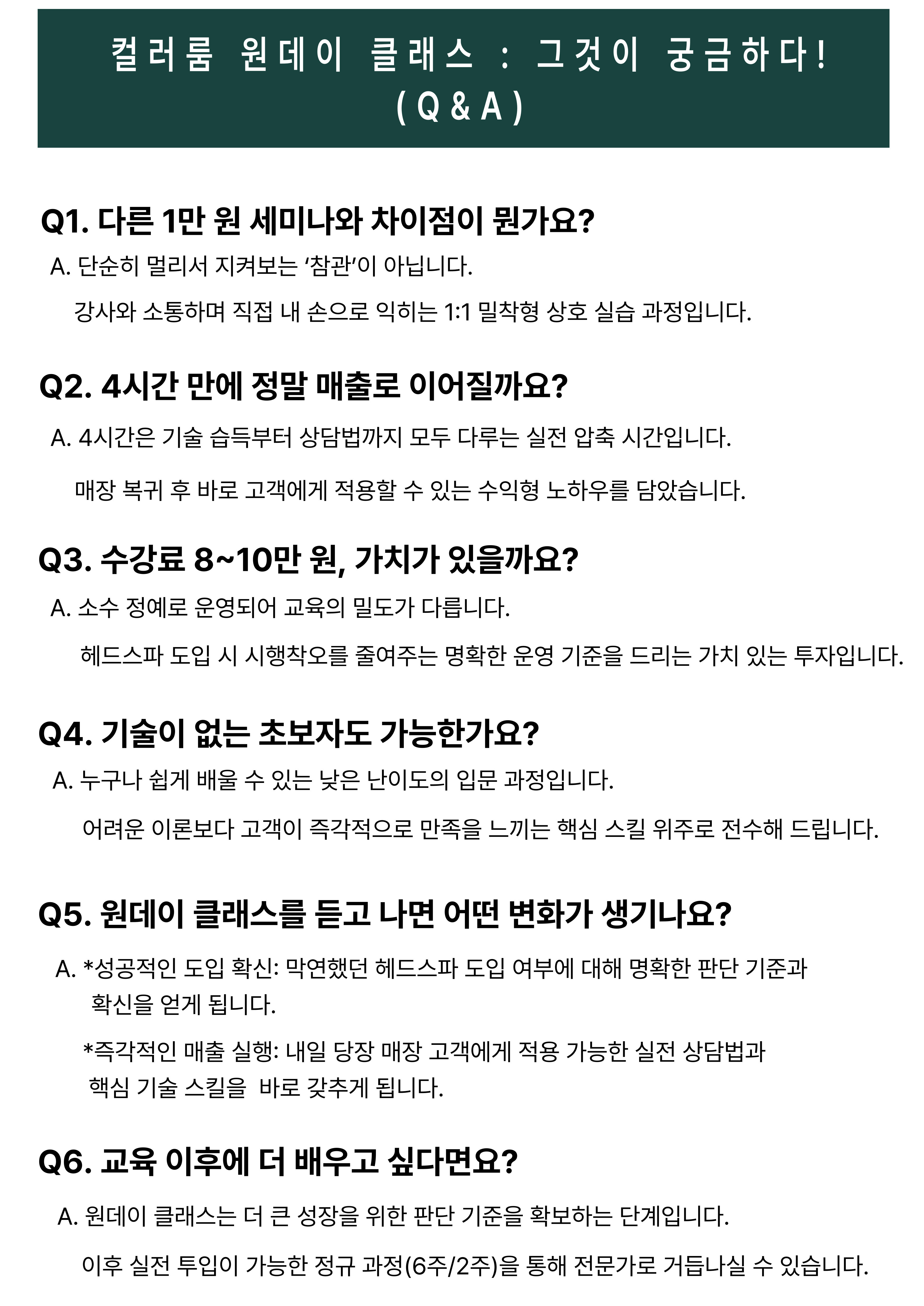 이번에 저희가 현장에서 쌓아온 노하우를 바탕으로, 더 많은 미용인분들과 성장의 즐거움을 나누고자 원데이 클래스를 오픈하였습니다.