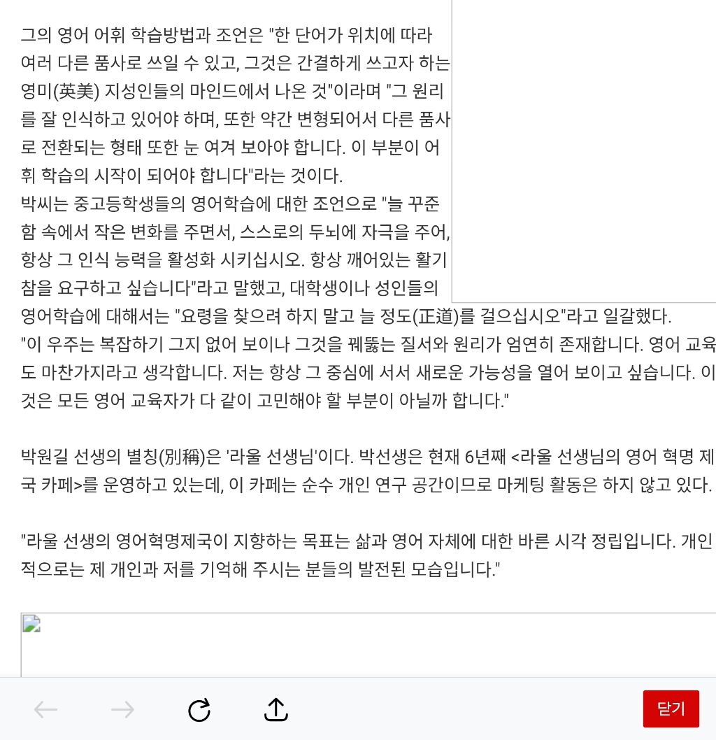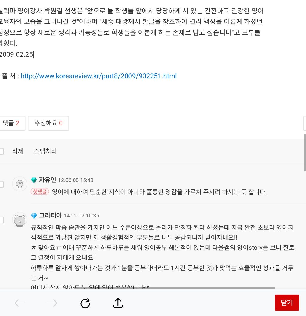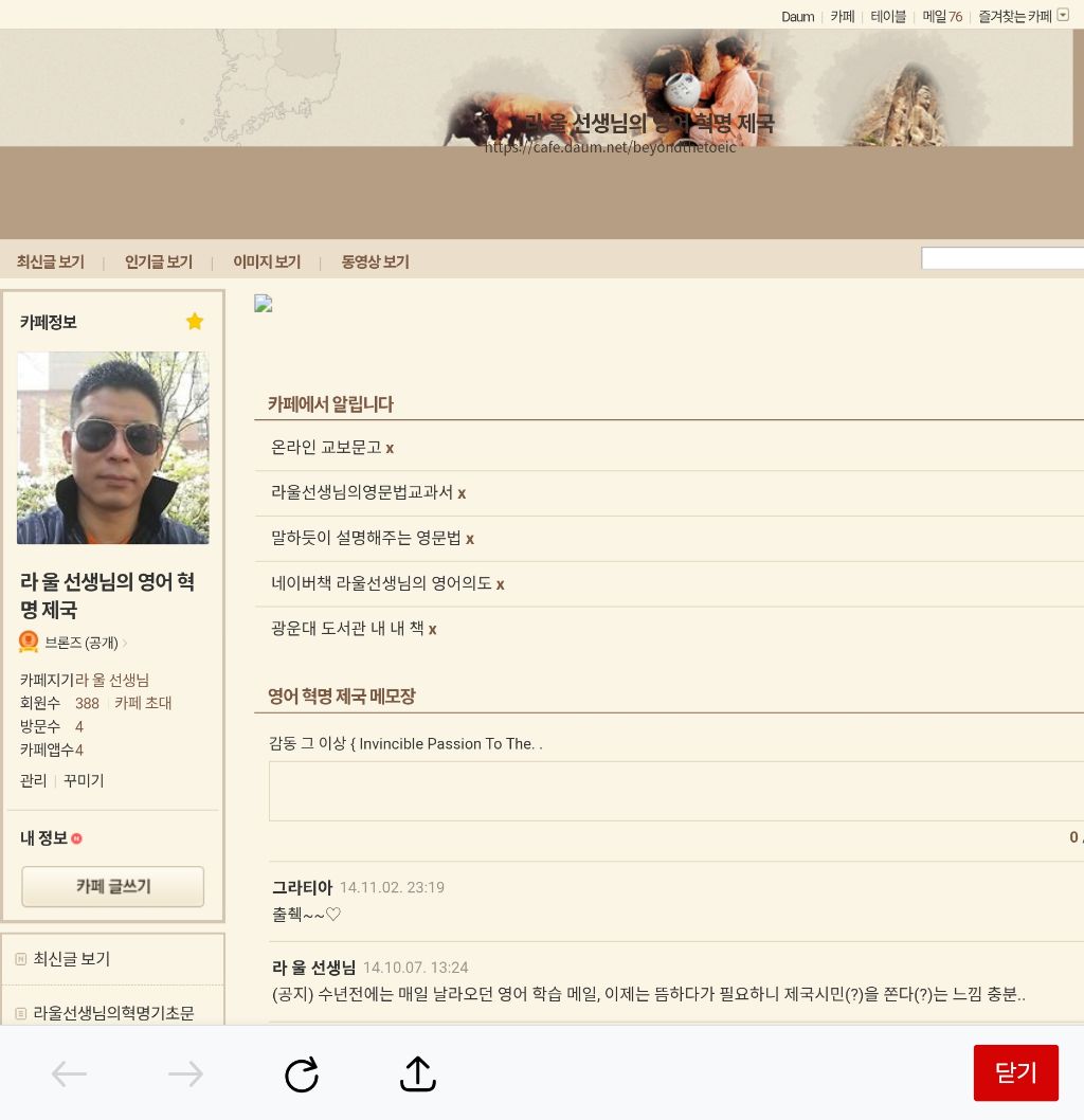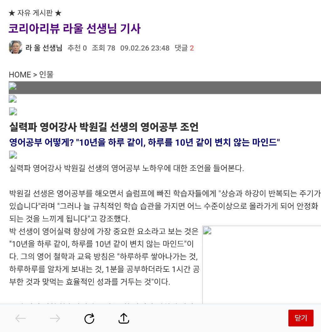 중고등 학생들 한창 가르칠때 코리아리뷰에서 이메일이 와 기사가 실린 적이 있었다. 십년을 하루같이 하루를 십년같이 꾸준히 변치않는 자세로 정진하다보면, 비록 상승과 하강이 반복될지라도 이루어져 가리라고 답해주었다. 그 대상이 영어공부이든 뭐든 간에 되어가는 것이다.