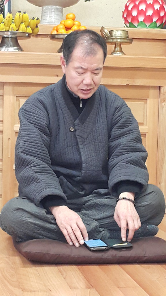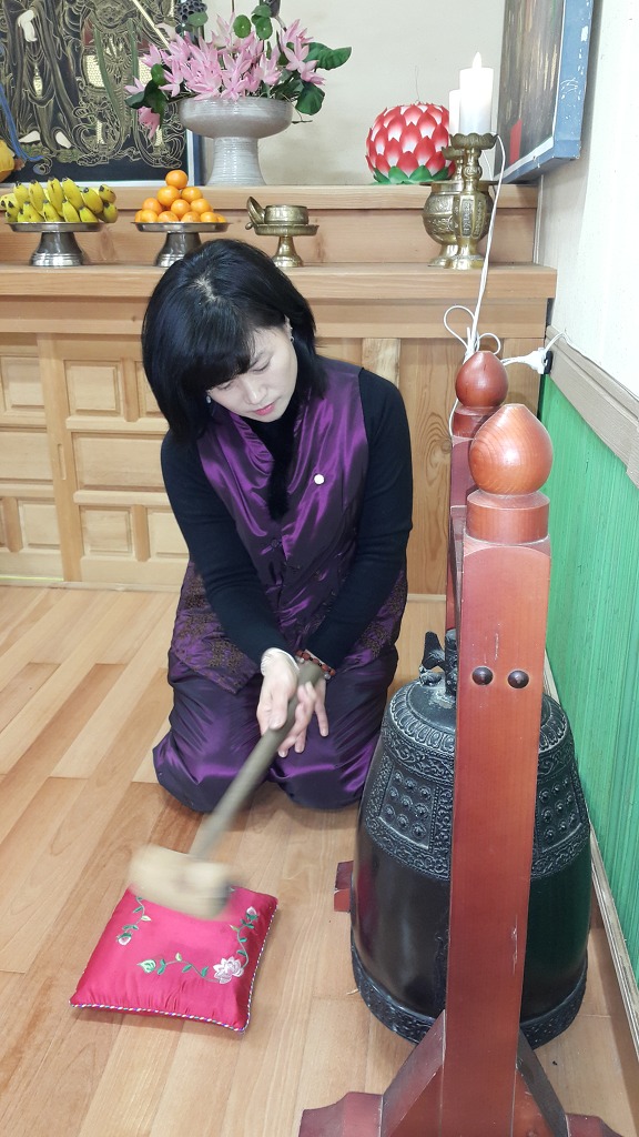 법회가 시작되기 전에 타종 연습 하시는 상진 포교사님