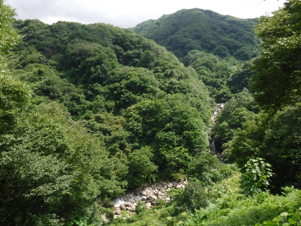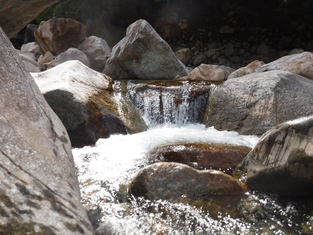 칠선계곡 의 기암절벽과 비단결 같은 암사면을 타고 폭류의 연속 크고 작은 둥근바위와 암반사이에서