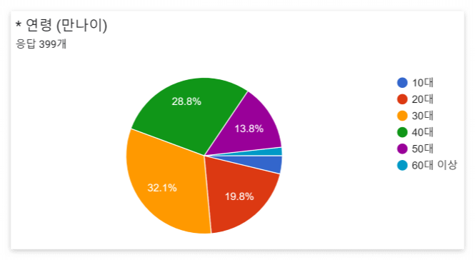 - 5조의 ' 대한축구협회 브랜드 이미지에 대한 현황 조사 ' 설문조사는 9월 29일부터 10월 6일까지였습니다. 총 399명이 설문조사에 응답해주셨습니다. 다들 참여해주셔서 결과를 도출하는데 많은 도움이 될거라 생각이 됩니다.
